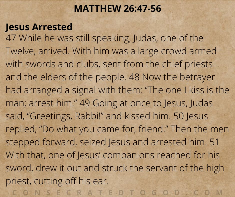 47 While he was still speaking, Judas, one of the Twelve, arrived. With him was a large crowd armed with swords and clubs, sent from the chief priests and the elders of the people. 48 Now the betrayer had arranged a signal with them: “The one I kiss is the man; arrest him.” 49 Going at once to Jesus, Judas said, “Greetings, Rabbi!” and kissed him.