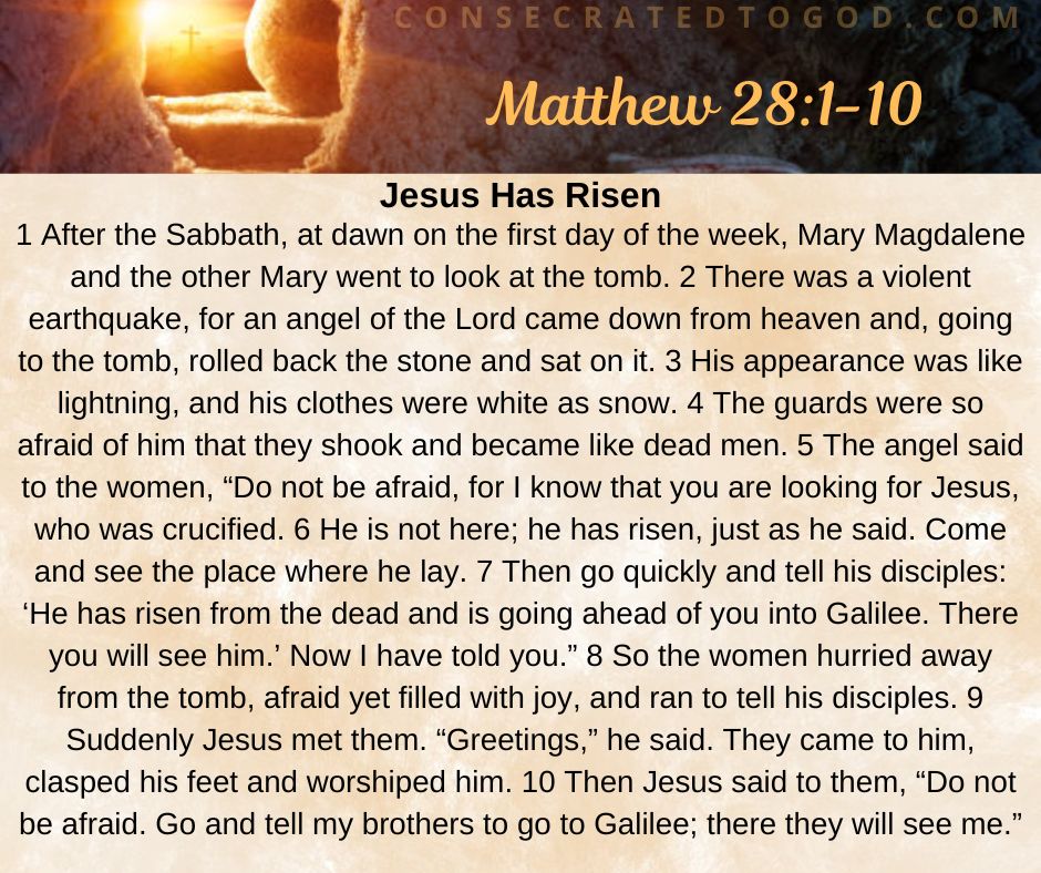 5 The angel said to the women, “Do not be afraid, for I know that you are looking for Jesus, who was crucified. 6 He is not here; he has risen, just as he said. Come and see the place where he lay. 7 Then go quickly and tell his disciples: ‘He has risen from the dead and is going ahead of you into Galilee. There you will see him.’ Now I have told you.”