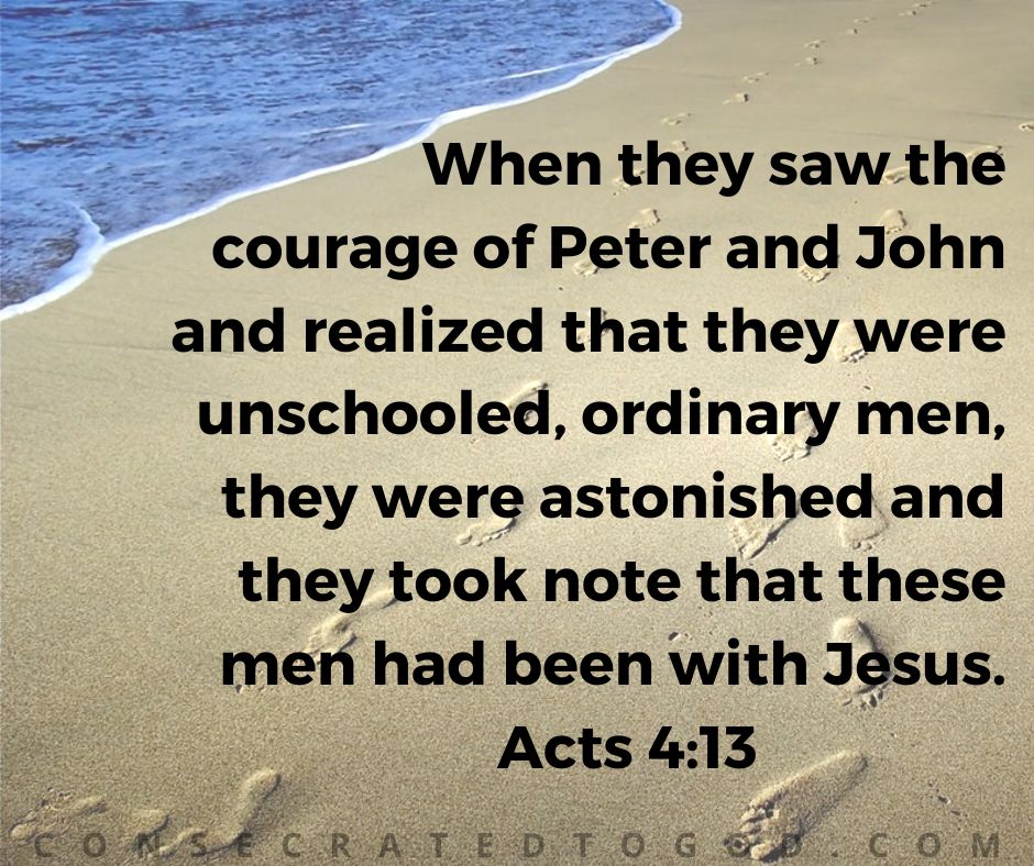 When they saw the courage of Peter and John and realized that they were unschooled, ordinary men, they were astonished and they took note that these men had been with Jesus.